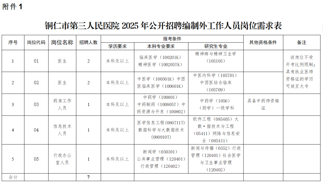 本次计划面向社会公开招聘编制外工作人员7名,具体招聘岗位及要求详见《铜仁市第三人民医院2025年公开招聘编制外工作人员岗位需求表》(附件1,以下简称《岗位需求表》)。